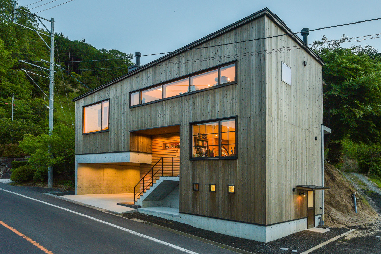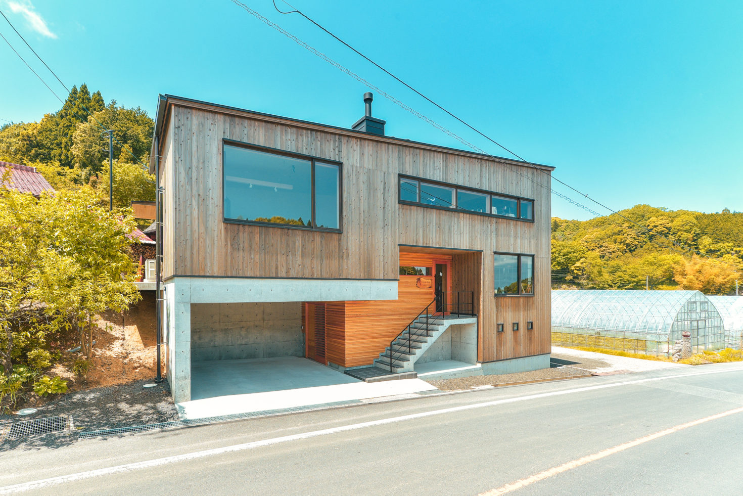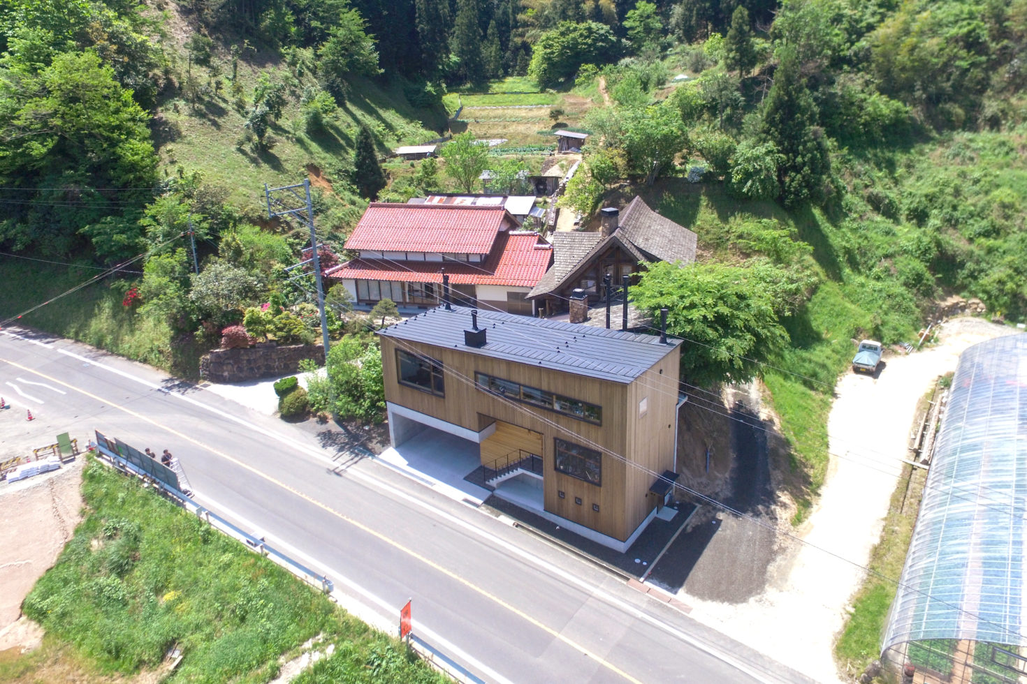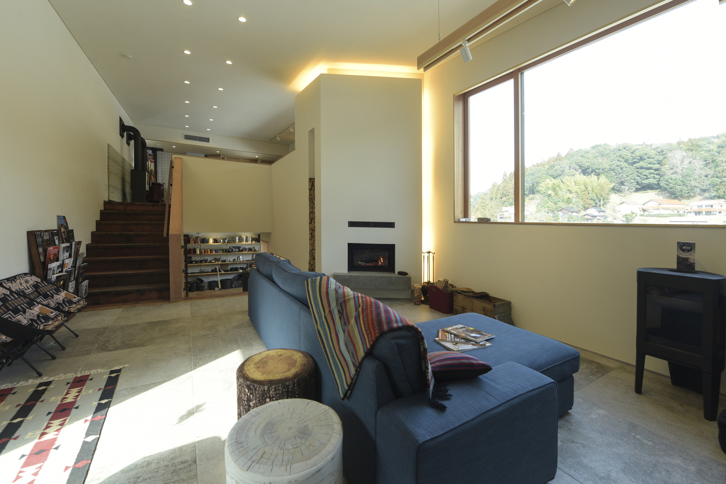 玉造温泉街から南に行った山間にある、薪ストーブ店舗のショールームである。敷地は背後の主屋やクライアント両親の実家と前面道路に挟まれた、奥行7m×間口15m程度の狭小地に限られている。前面道路と背後の地盤では3m程度のレベル差があり、敷地が面する前面道路の両端でも1m弱のレベル差がある傾斜地である。こうした制約の多い敷地に、ショールーム、キッチンダイニング、倉庫、駐車場などの機能を収めることが求められた。