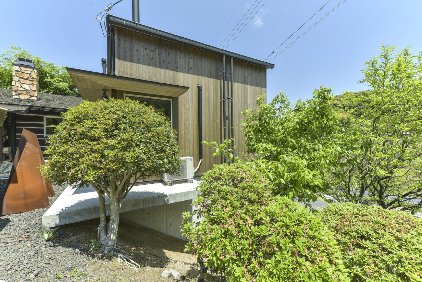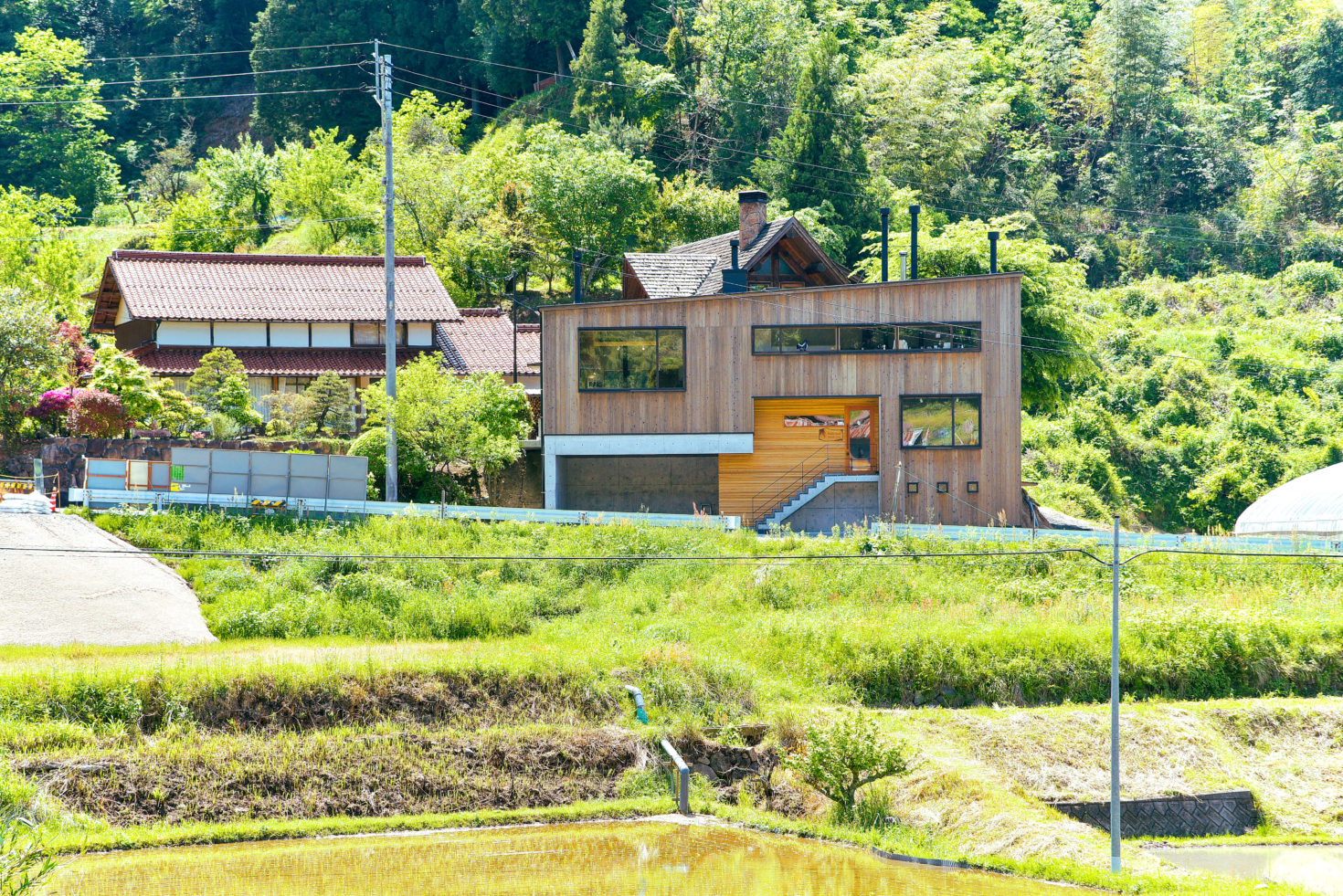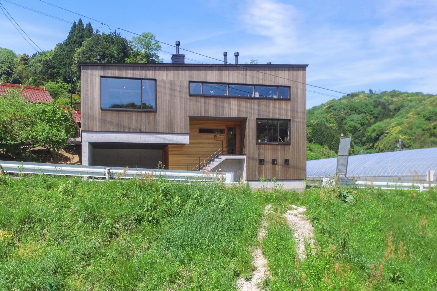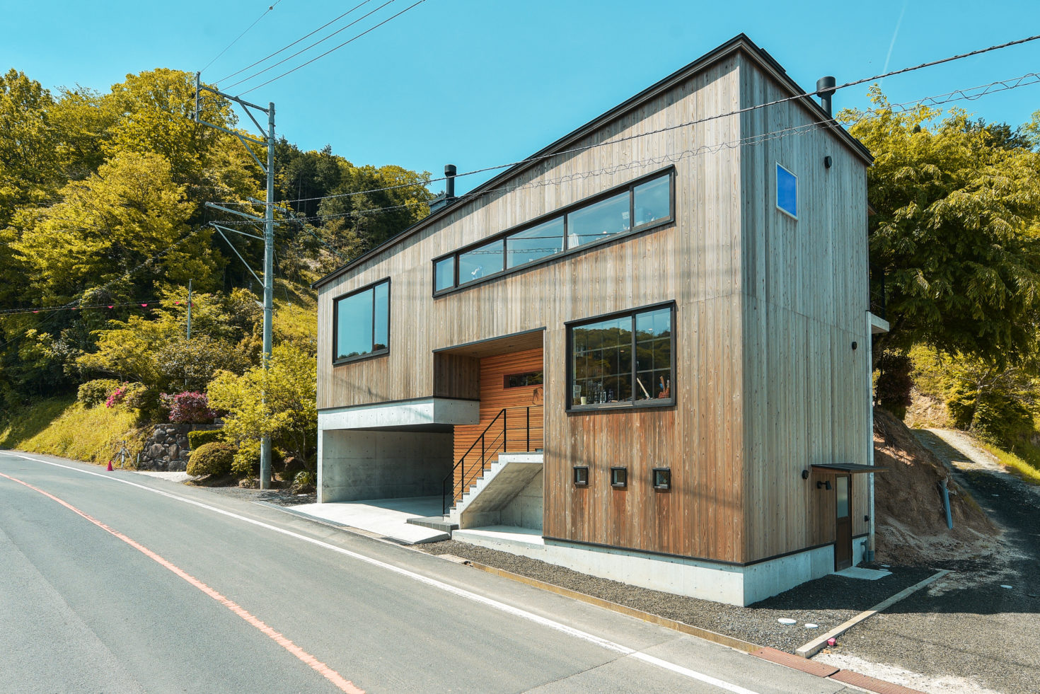 玉造温泉街から南に行った山間にある、薪ストーブ店舗のショールームである。敷地は背後の主屋やクライアント両親の実家と前面道路に挟まれた、奥行7m×間口15m程度の狭小地に限られている。前面道路と背後の地盤では3m程度のレベル差があり、敷地が面する前面道路の両端でも1m弱のレベル差がある傾斜地である。こうした制約の多い敷地に、ショールーム、キッチンダイニング、倉庫、駐車場などの機能を収めることが求められた。
