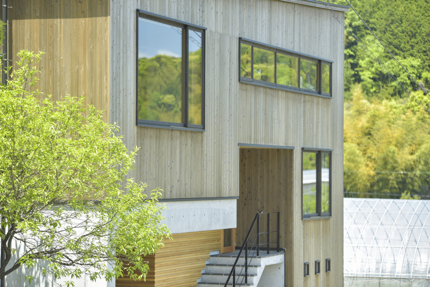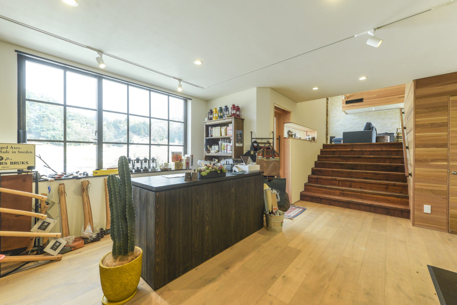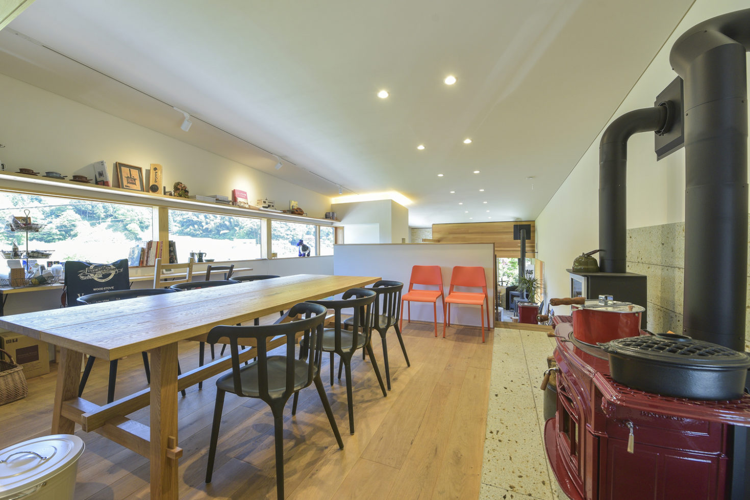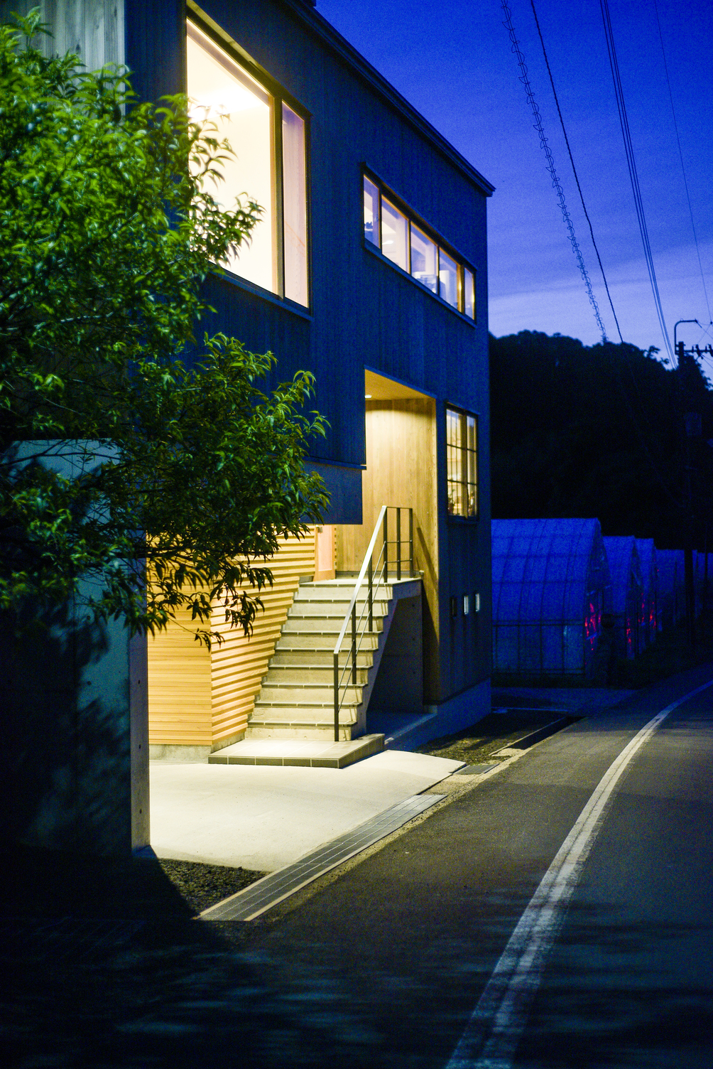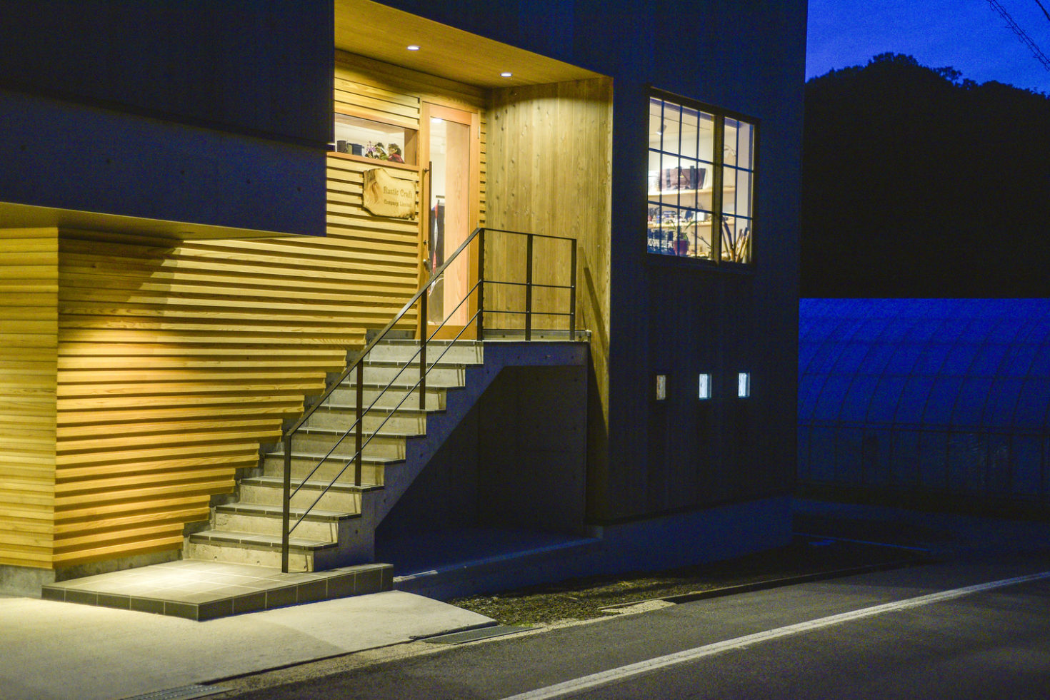 玉造温泉街から南に行った山間にある、薪ストーブ店舗のショールームである。敷地は背後の主屋やクライアント両親の実家と前面道路に挟まれた、奥行7m×間口15m程度の狭小地に限られている。前面道路と背後の地盤では3m程度のレベル差があり、敷地が面する前面道路の両端でも1m弱のレベル差がある傾斜地である。こうした制約の多い敷地に、ショールーム、キッチンダイニング、倉庫、駐車場などの機能を収めることが求められた。