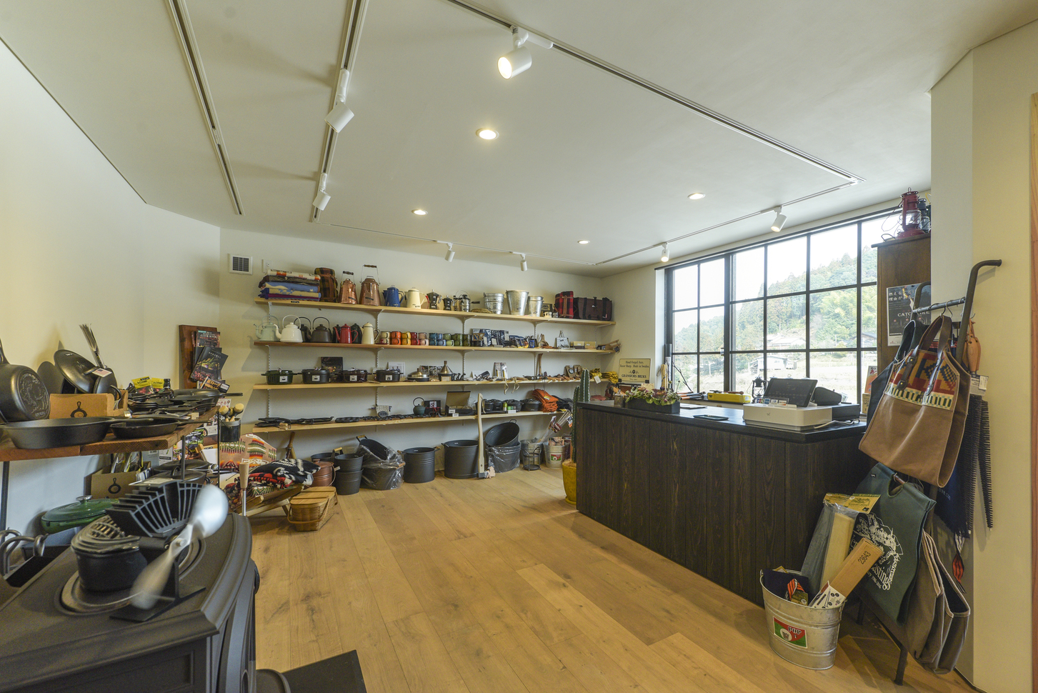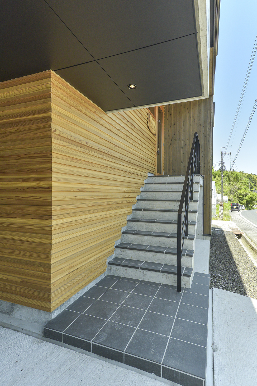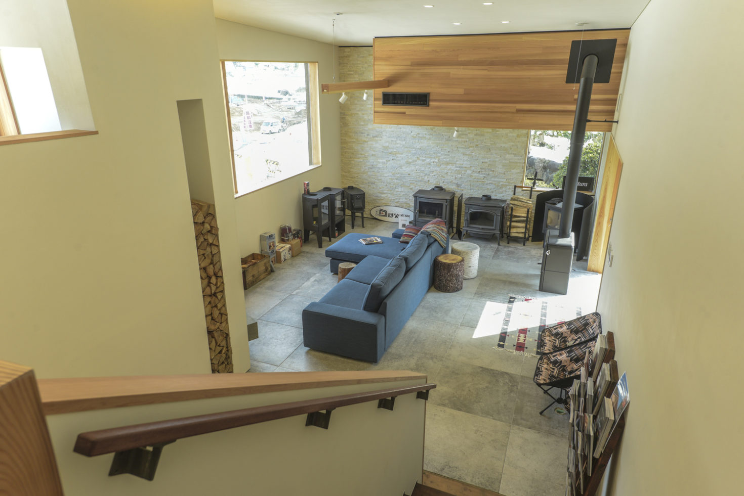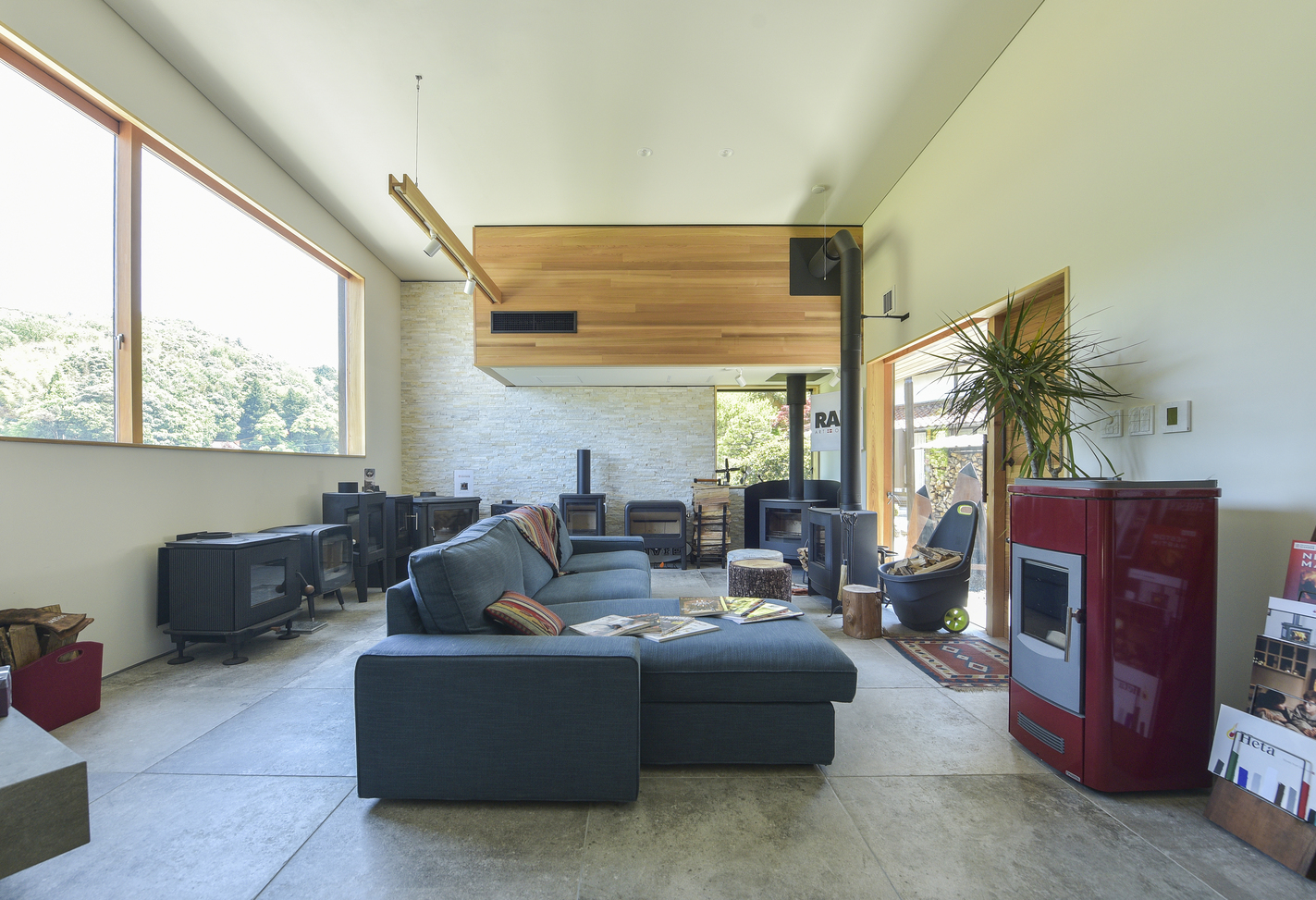 玉造温泉街から南に行った山間にある、薪ストーブ店舗のショールームである。敷地は背後の主屋やクライアント両親の実家と前面道路に挟まれた、奥行7m×間口15m程度の狭小地に限られている。前面道路と背後の地盤では3m程度のレベル差があり、敷地が面する前面道路の両端でも1m弱のレベル差がある傾斜地である。こうした制約の多い敷地に、ショールーム、キッチンダイニング、倉庫、駐車場などの機能を収めることが求められた。