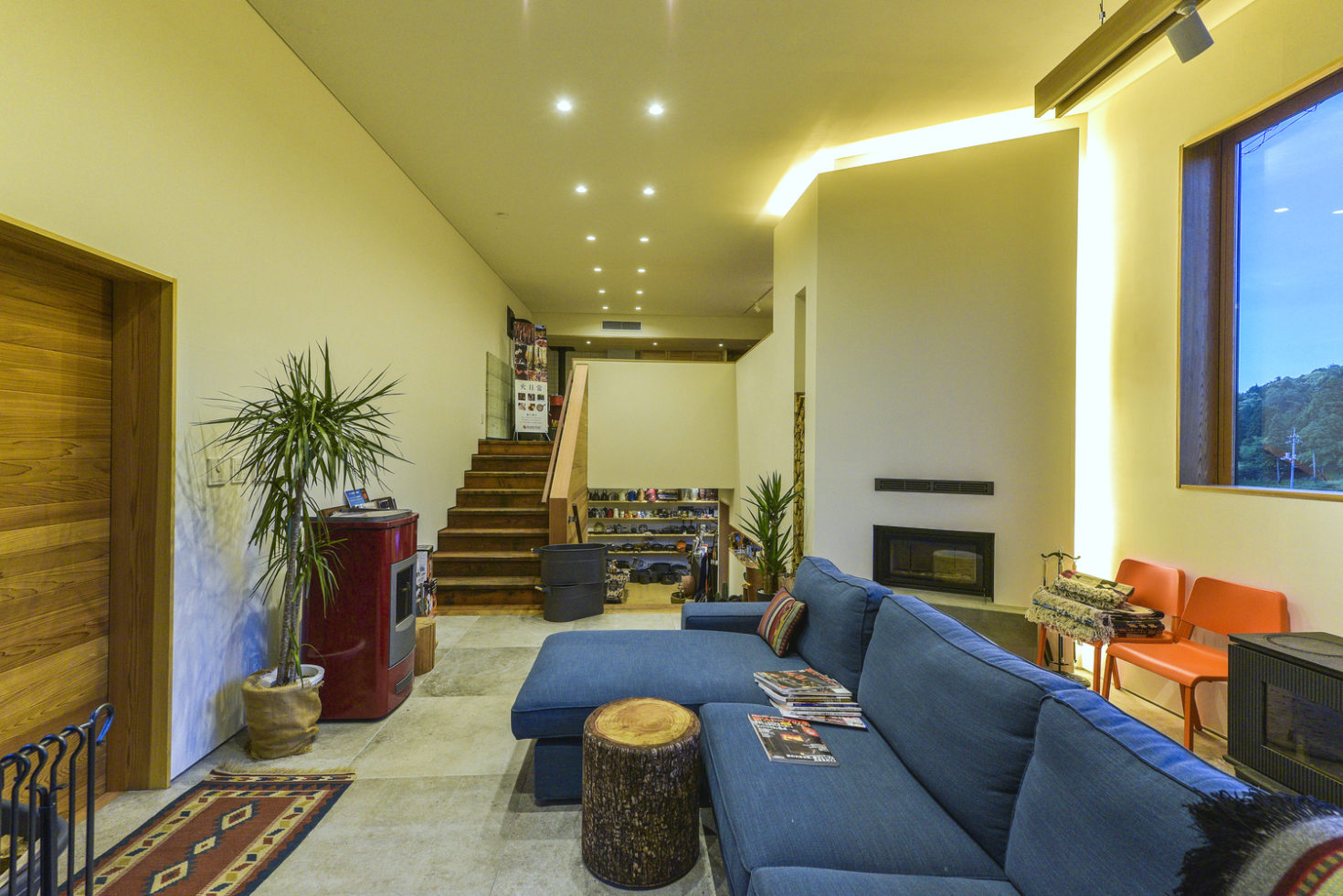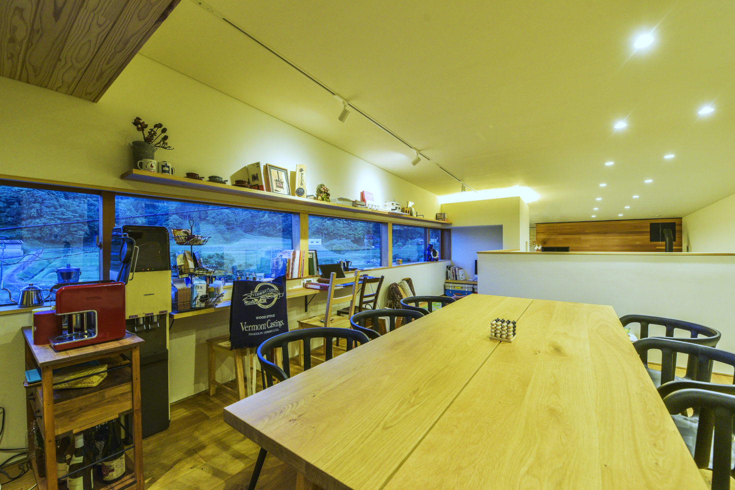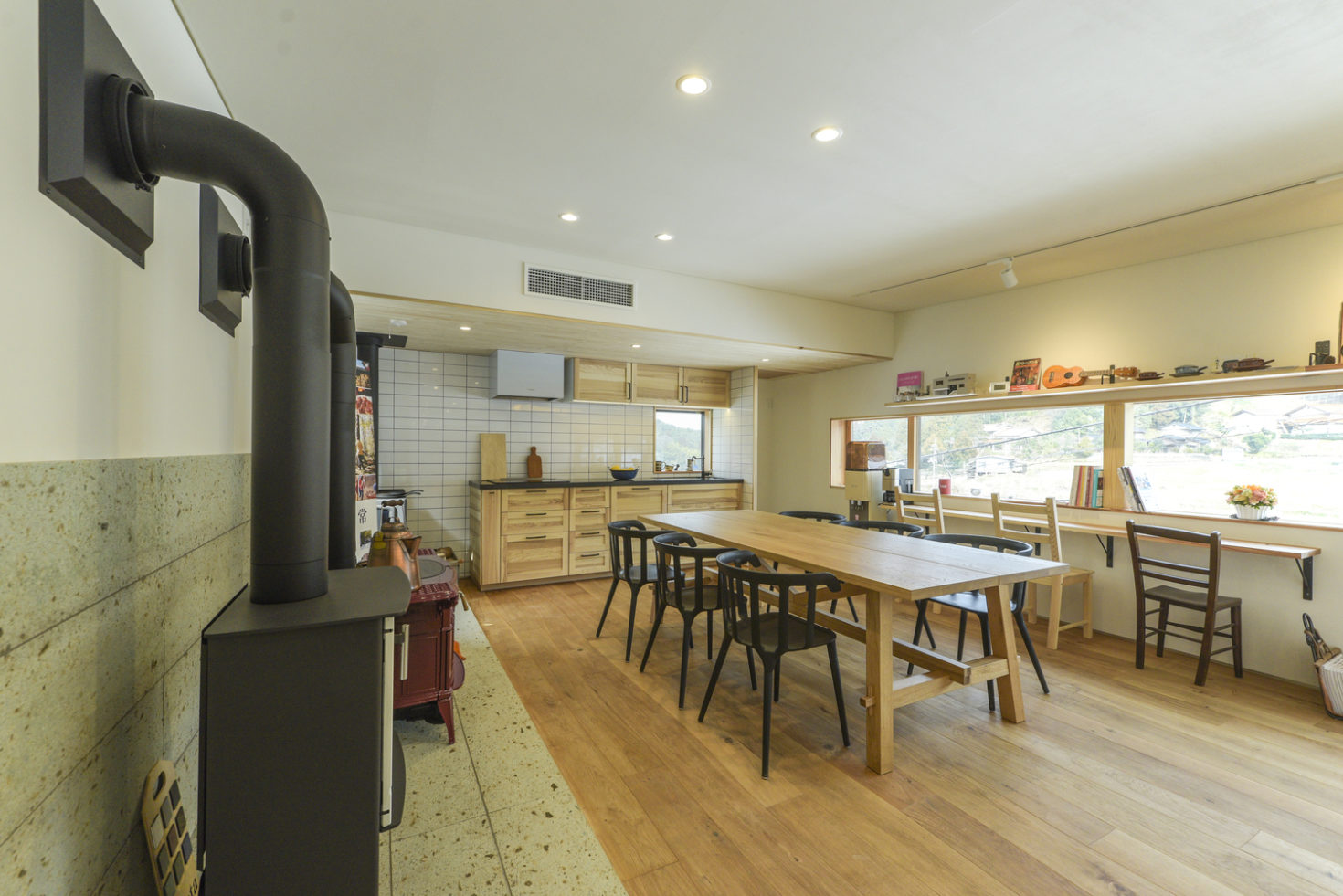 入念な気密断熱の計画・施工により、冬は薪ストーブの暖気空間全体に行き渡らせることができる。また唯一離れた下階のトイレには、リビングに設置したのストーブからダクトで暖気を送り込む計画としている。夏は窓を開けるだけで自然と重力換気ができ、冷房をあまり必要とせず、冷涼な谷風を建物に取り入れることができる。