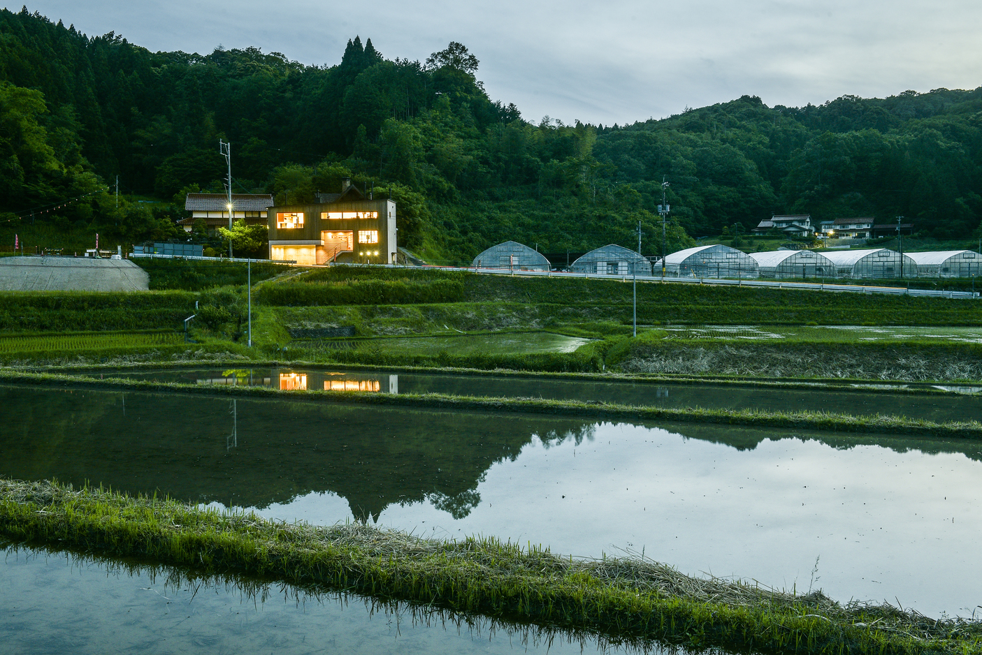 周囲は棚田が広がる自然豊かな場所であるため、時が経つにつれ経年変化で景観と調和する、木やコンクリートなどの素材感を活かした、シンプルなシルエットの外観とした。各フロアには玉湯大谷の四季の風景を一望できる大きな開口部を設け、冬は雪景色のパノラマを眺めながら、薪ストーブで暖まった内部空間との対比を実感できることが、この建物の一番の魅力である。