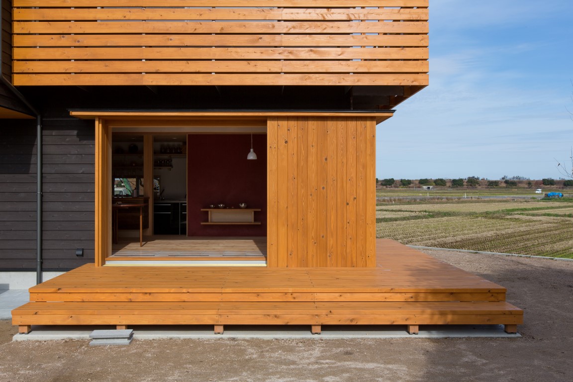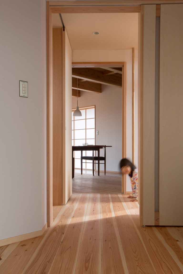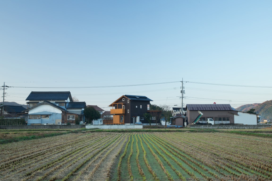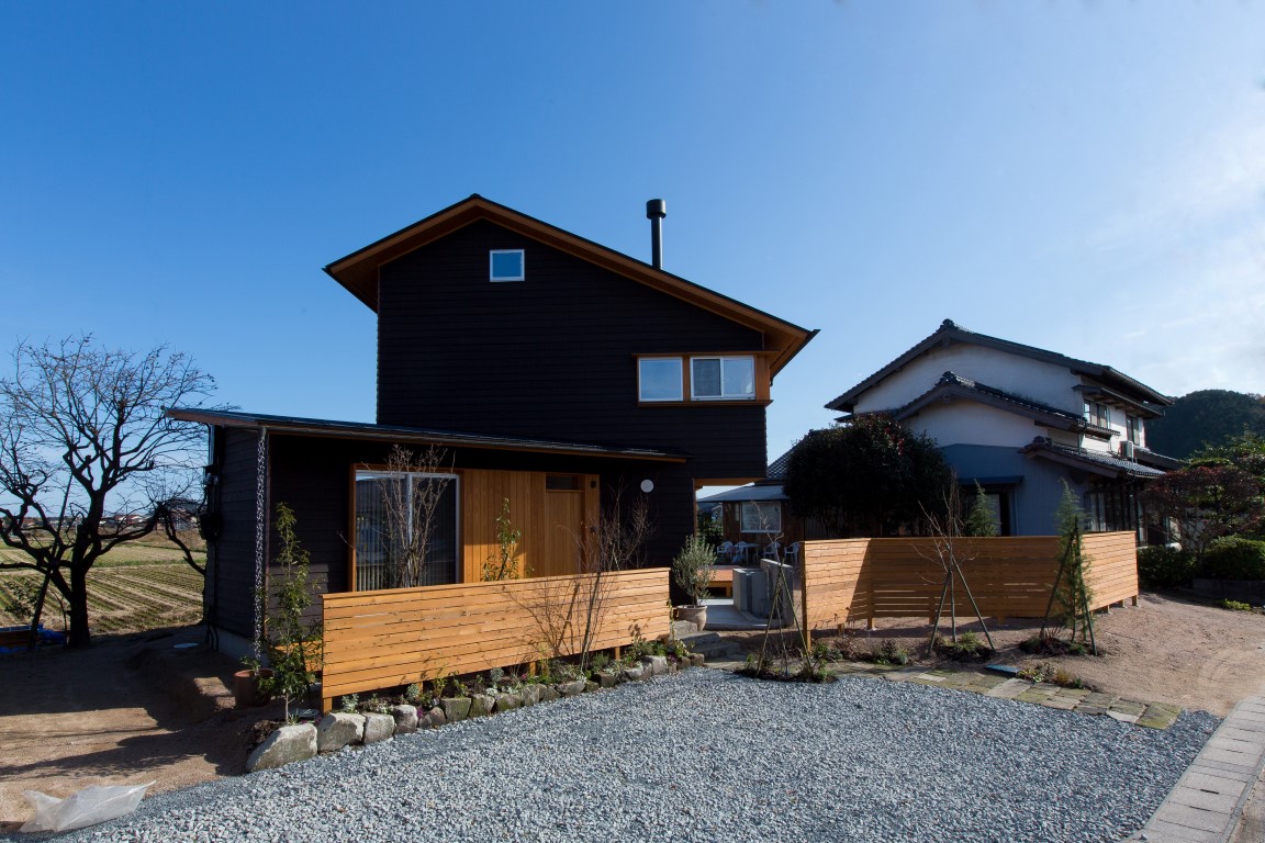 コンパクトな2階建の家であるが、季節の移ろいや生活スタイルの変化に合わせて、家族とともに成長していくような家づくりを目指した。外装は焼杉の下見張とし、新しいけれどもどこか懐かしく、田園の景観になじむよう心がけた。室内は杉材、和紙、タイルなど、素材の持つ特性や質感を見定めて、ローコストながらもバランスよく品のあるインテリアを目指した。リビングの大きな木製建具はフルオープンができ、障子・ガラス戸・格子網戸を使い分けることで、屋内外が一体となる様々な生活のしつらいをつくりだせる。