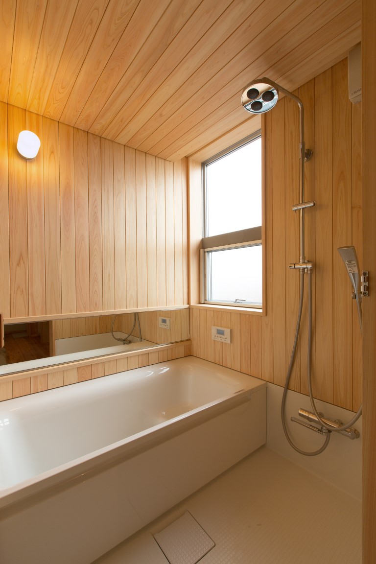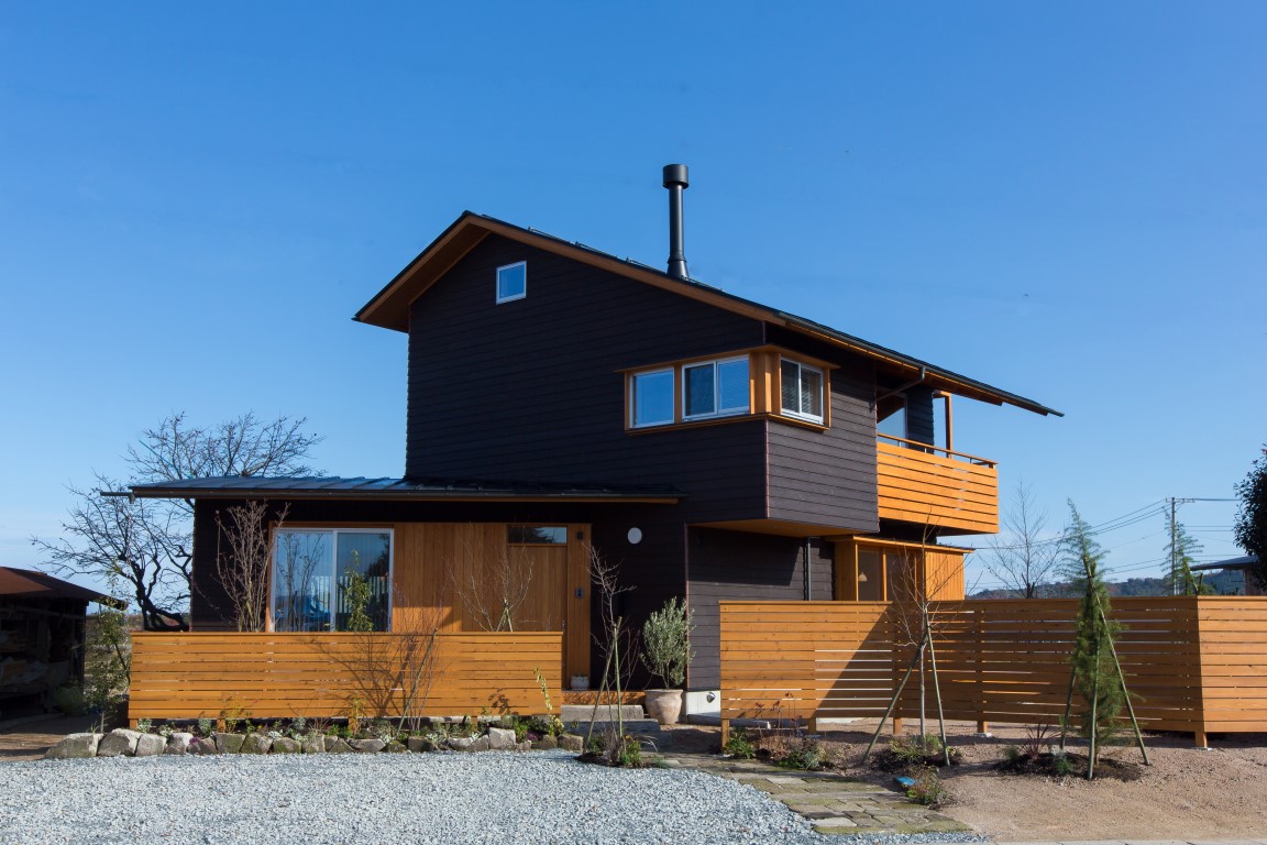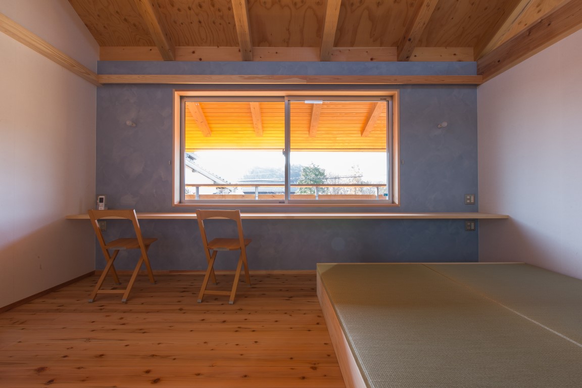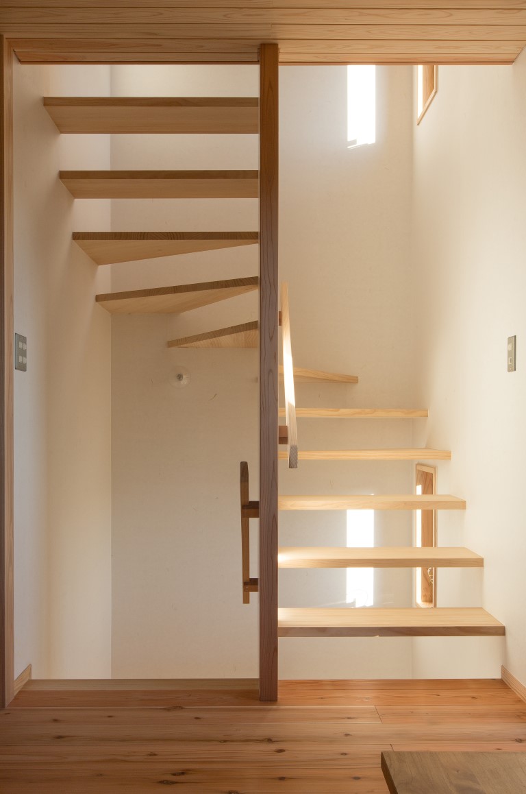 コンパクトな2階建の家であるが、季節の移ろいや生活スタイルの変化に合わせて、家族とともに成長していくような家づくりを目指した。外装は焼杉の下見張とし、新しいけれどもどこか懐かしく、田園の景観になじむよう心がけた。室内は杉材、和紙、タイルなど、素材の持つ特性や質感を見定めて、ローコストながらもバランスよく品のあるインテリアを目指した。リビングの大きな木製建具はフルオープンができ、障子・ガラス戸・格子網戸を使い分けることで、屋内外が一体となる様々な生活のしつらいをつくりだせる。