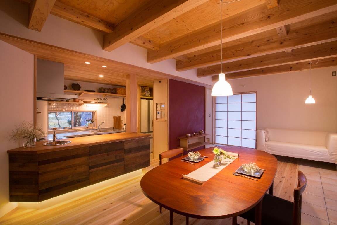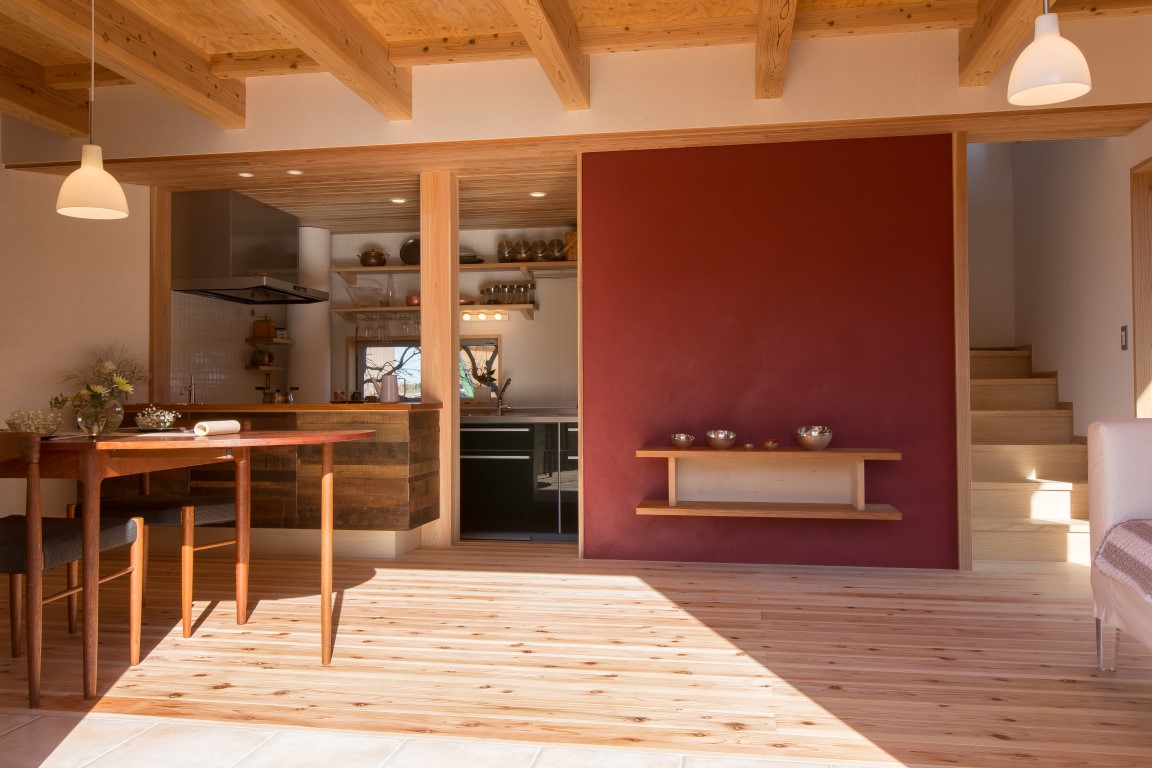 構造材は全て島根県産材を使用し、耐震等級2を満たす計画としている。中央の大黒柱と外周部の耐力壁で荷重を負担させ、内部の壁は全て非耐力壁としている。そのため家族構成の変化などによる、将来的な間仕切変更にも対応がしやすい計画とした。
