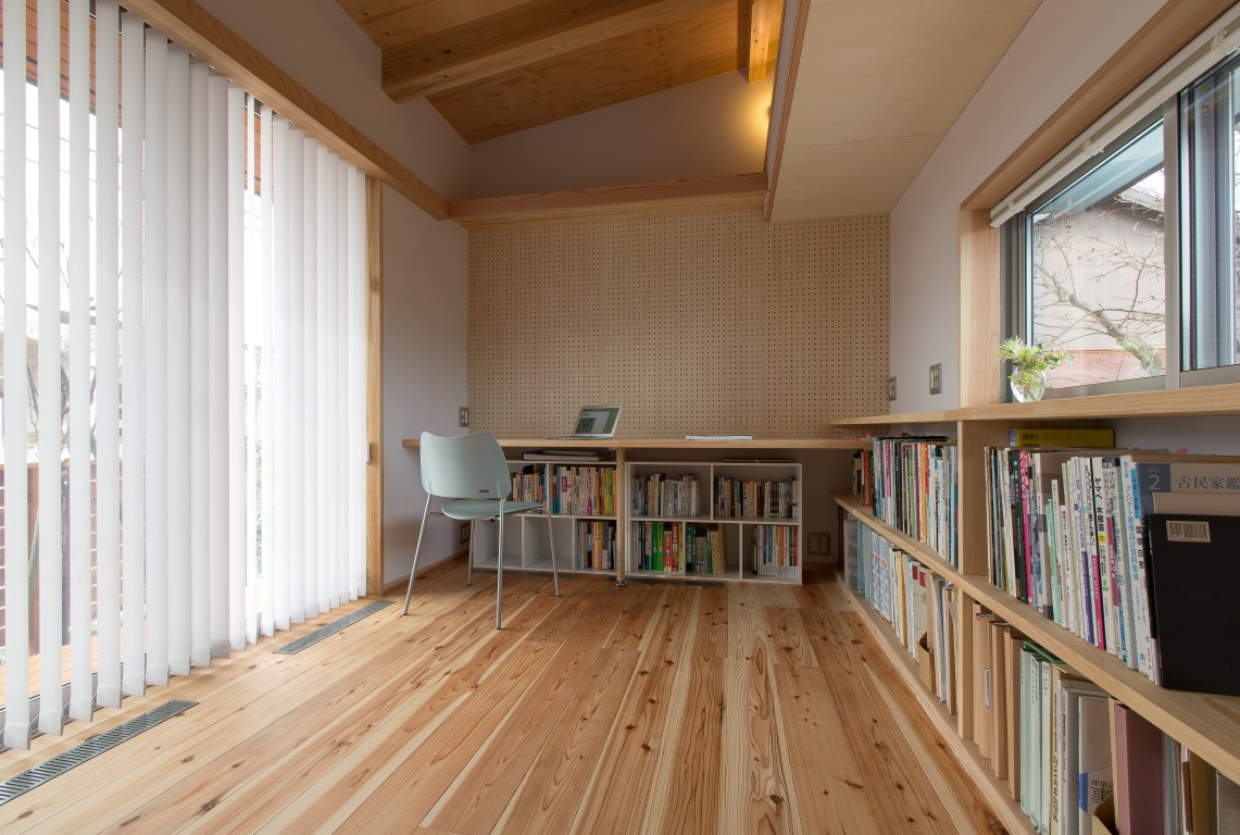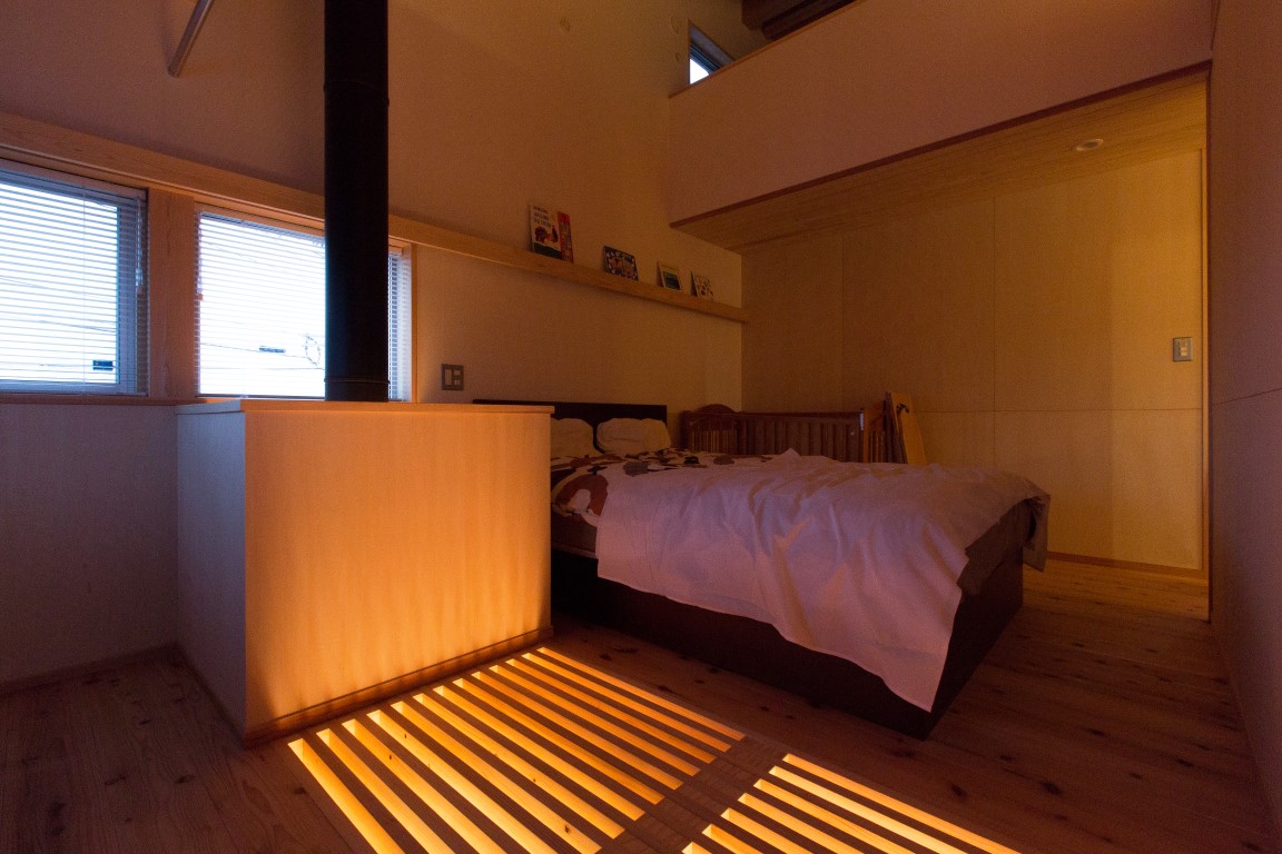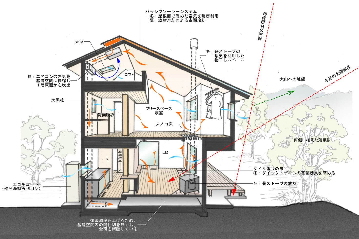 また、山陰の陰鬱な冬をいかに快適に過ごせるかということを、大きなテーマとした。そのために、「空気が流れる空間づくり」「冷暖房の効果的な活用」「室内の温度差を無くす」ことを重視している。断熱性能は省エネ対策等級4を満たし、各部屋はランマや小吹抜、スノコ床などでつなげて、家全体をひとつの空間とした。小さな吹抜とスノコ床を階段の対角線上に配置することで、上下階を含めて家全体で空気が対流する計画としている。太陽熱を利用するパッシブソーラーシステムを設置し、屋根面で集熱・冷却した外気をダクトで基礎空間内に送り込む計画としている。冬は薪ストーブで暖められた空気を、夏は小屋裏に設置したエアコンの冷気を1階床下に循環させ、足元から住空間全体を冷暖房できる計画とした。