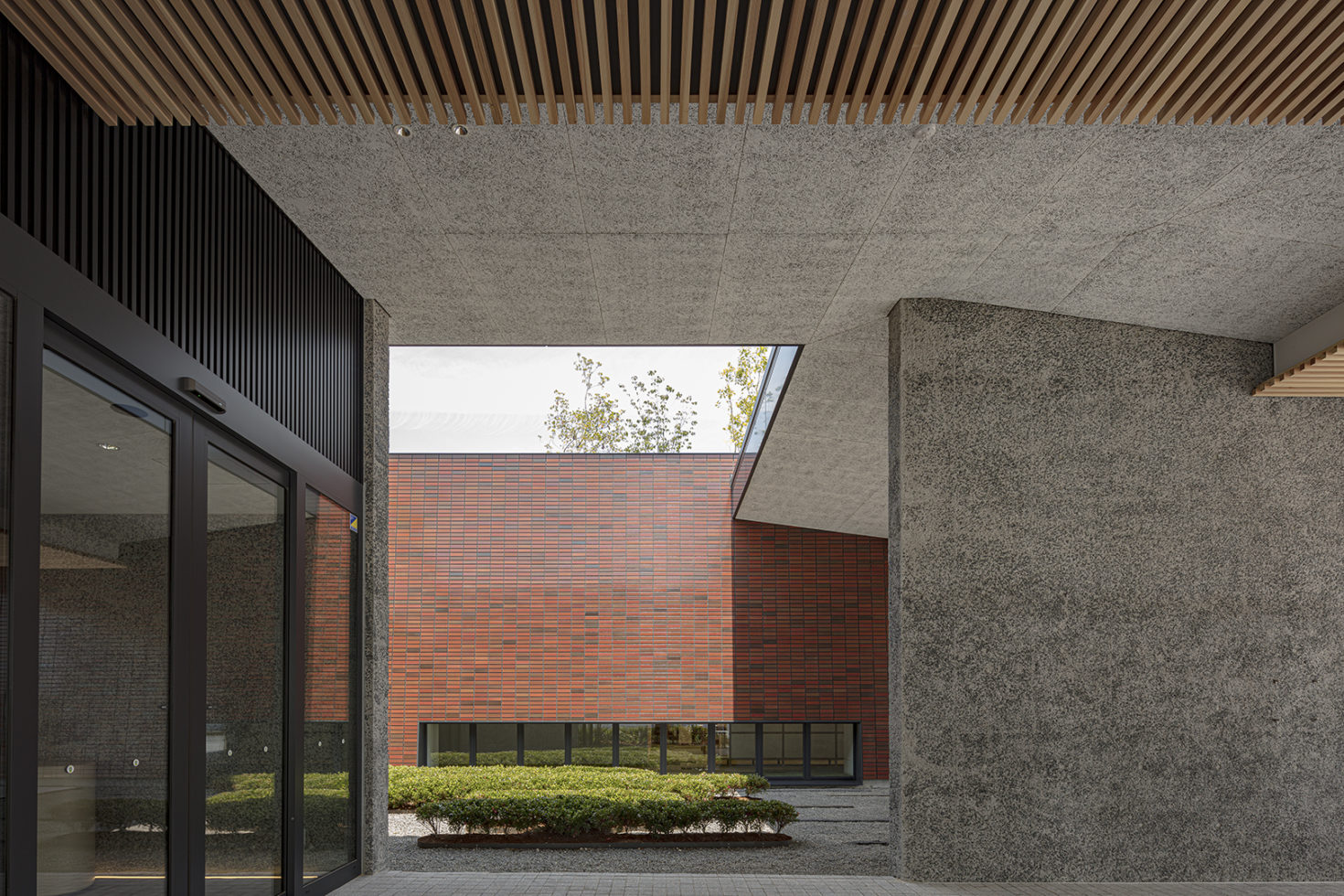 Our proposal was for a building with specific areas for different uses, arranged like a stone garden, with the surrounding area wrapped in a transparent space. We created a space where people can walk around in three dimensions, including the rooftop garden, and where they can sit and rest. This way, each user can find their favorite spot and see various views and behaviors. The spaces are connected in a relaxed way, with places to stop and rest scattered around, and there are also various features that encourage spontaneous communication between employees. The inside and outside of the building are designed with a variety of elements, including sashes, wooden louvers, concrete volumes, planting, and stone walls, to create a boundary surface. We designed the building’s exterior to be multi-layered and dignified, using materials that respond to the changing seasons. This creates a facade that clearly differentiates between the areas that provide protection from the weather and those intended for relaxation. The result is a space where even the movement of people, seen between the different sections of the building, blends into the surrounding landscape.