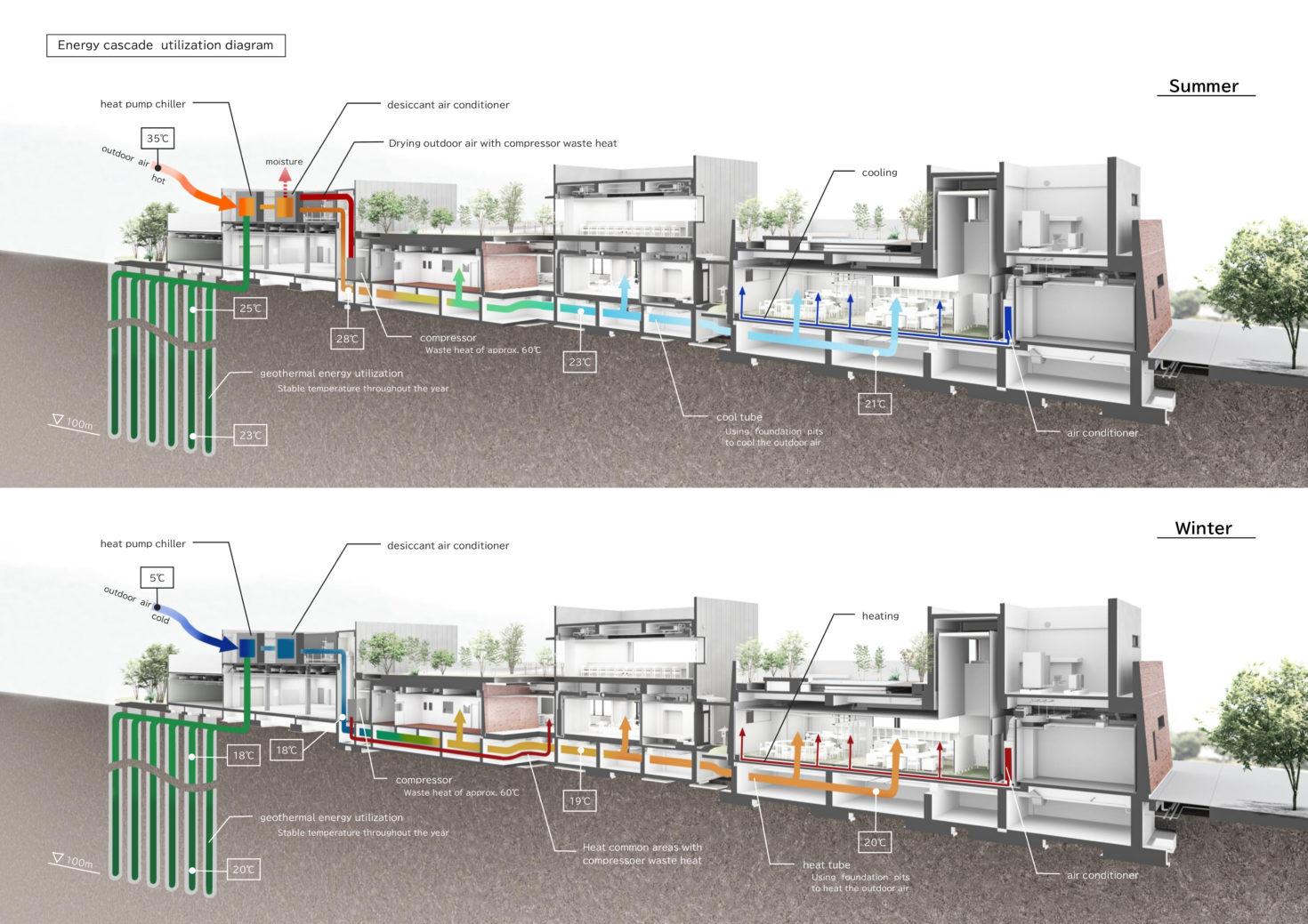 また、環境に親和した建築とすべく、「そこにある熱源」の意欲的な活用を試みている。今回のプロジェクトにおける「そこにある熱源」とは、ジオサーマルと工場排熱である。地下100mの地中熱と、基礎ピット(クール・ヒートチューブ)の熱は、一年を通して大地が供給する安定した熱源であり、工場のコンプレッサーからは約60℃の排熱が常時排出されている。これらを熱源としたデシカント空調システムを構築し、エネルギーのカスケード利用を試みた。太陽光パネルの設置や高効率機器の採用という付加的な技術対応ではなく、その場にすでにあるものを活かし、工場が稼働するほど社員の快適性に寄与するという、ユニークな環境建築を実現している。