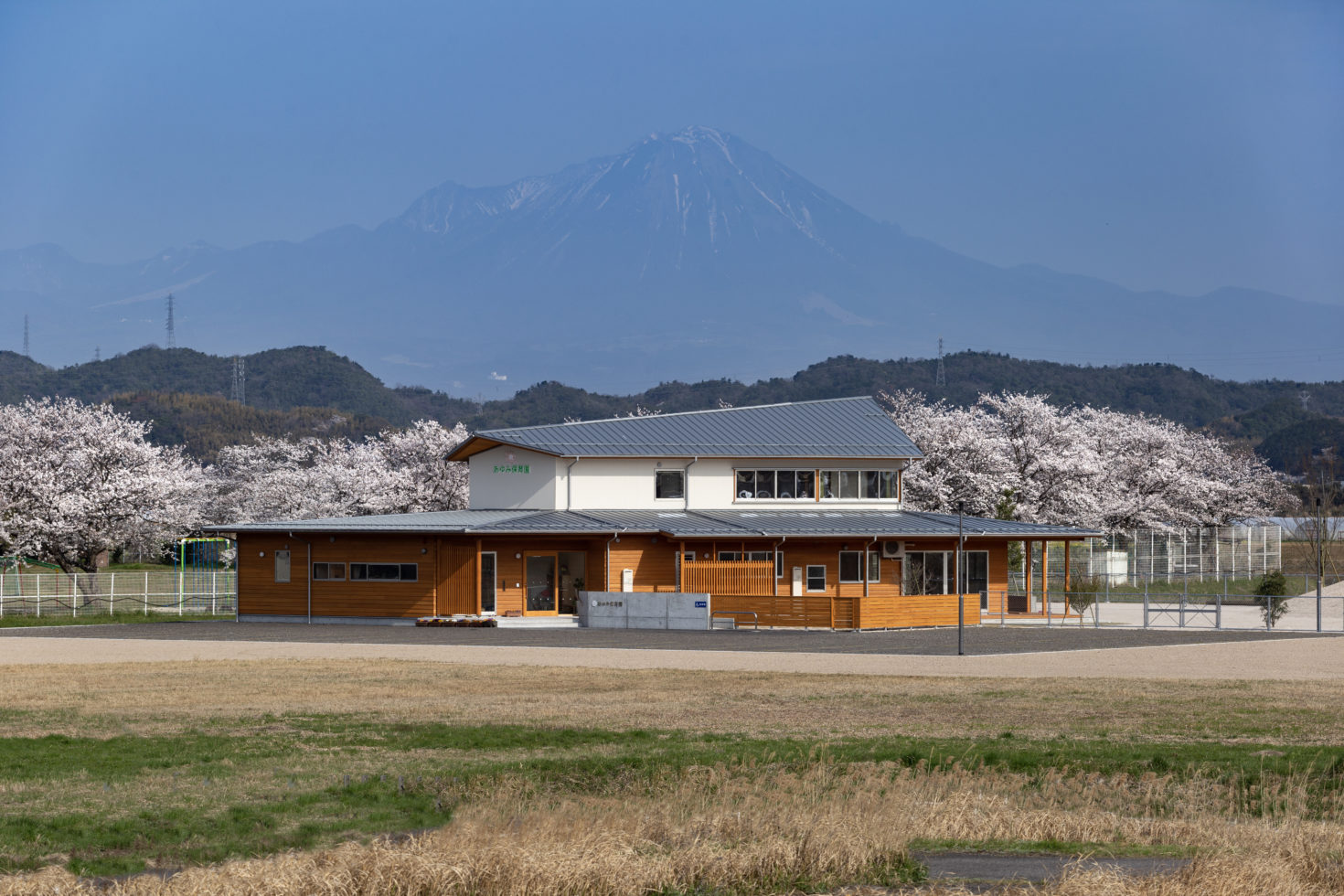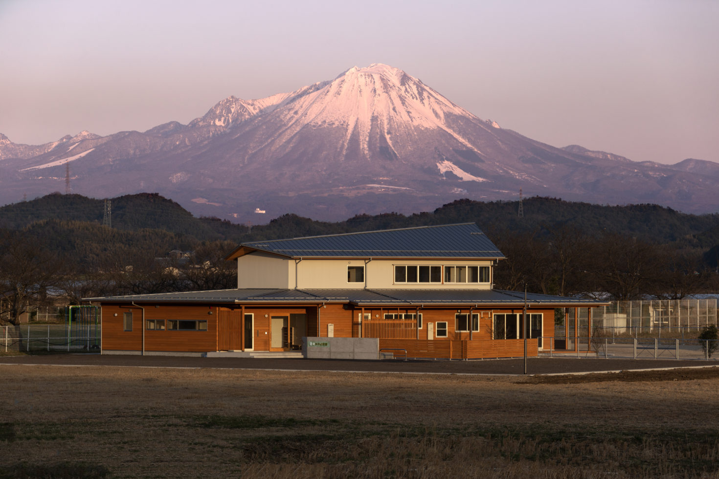 This nursery school is located about 4 km east of the center of Yasugi City, on the Nakaumi Reclamation Land. The area around it is filled with villages along the former lake wall, and you can see Mt. Daisen to the east.