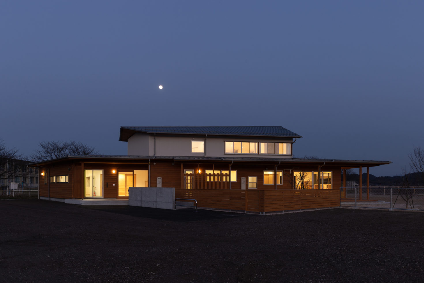 おおらかな三角屋根には、大山を背景に大空に向かって飛び立とうとする紙飛行機のシルエットを重ねた。ここから飛び立っていく子どもたちにとって、思い出に残る原風景になればと思う。子供たちとともに園庭の木々も成長し、干拓地の中に新しい景観が育っていくことを期待している。