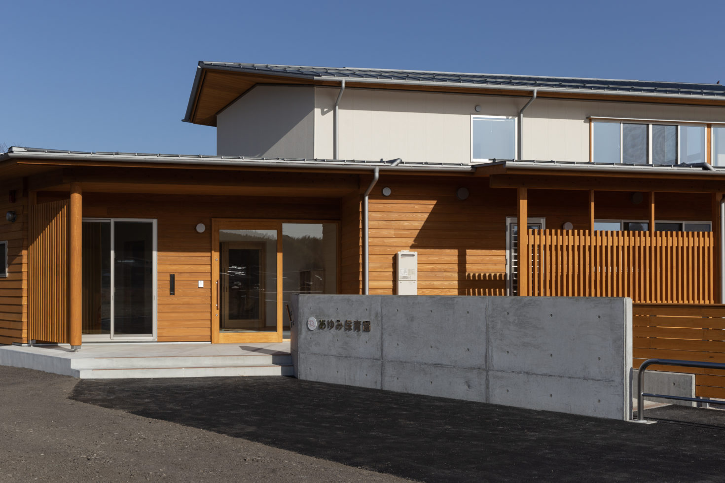 外装は、杉板張りの壁とシルバーの金属屋根として、子供たちの建物としての温かみや柔らかさ、軽やかさ、若々しさを感じられるようにした。また、シルバーの屋根は、太陽光を室内に導くライトシェルフとしての役割もあり、自然光で明るい室内を実現している。