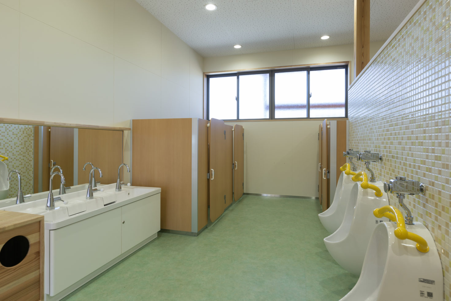 The playroom and the garden are connected by a series of 12 large wooden fittings that can be fully opened. If you look at the path from the entrance hall to the playroom, terrace, and garden in the shape of a fan, you’ll see that this space represents the philosophy of Ayumi Nursery School.