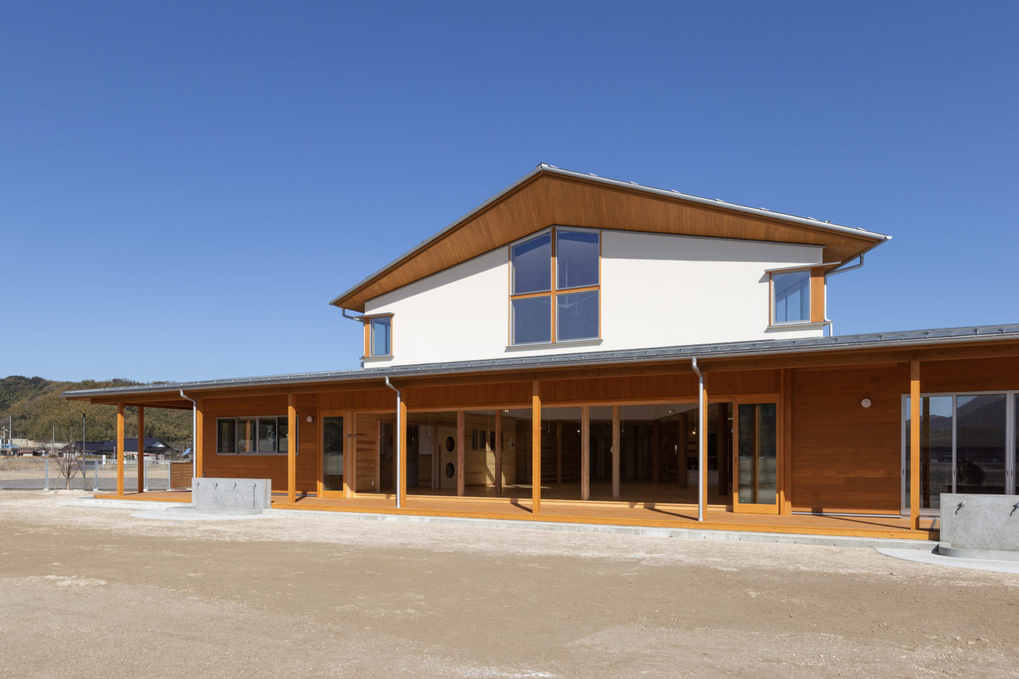 The triangular roof looks like a paper plane taking off into the sky, with Mount Daisen in the background. We hope that this nursery school will be a memorable part of the original scenery for the children who will grow up here. As the children grow up, we hope that the trees in the garden will also grow, and that a new scenery will be nurtured in this place.